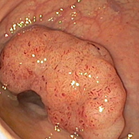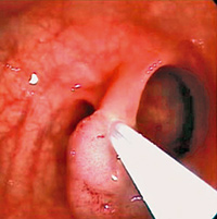 Image of a larger, broad-based polyp. This polyp cannot be removed in one piece without special instruments and techniques, but must be fragmented.